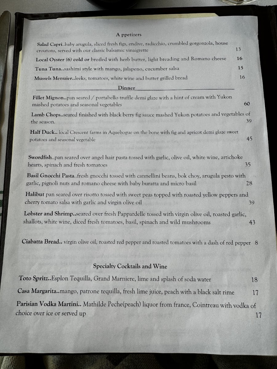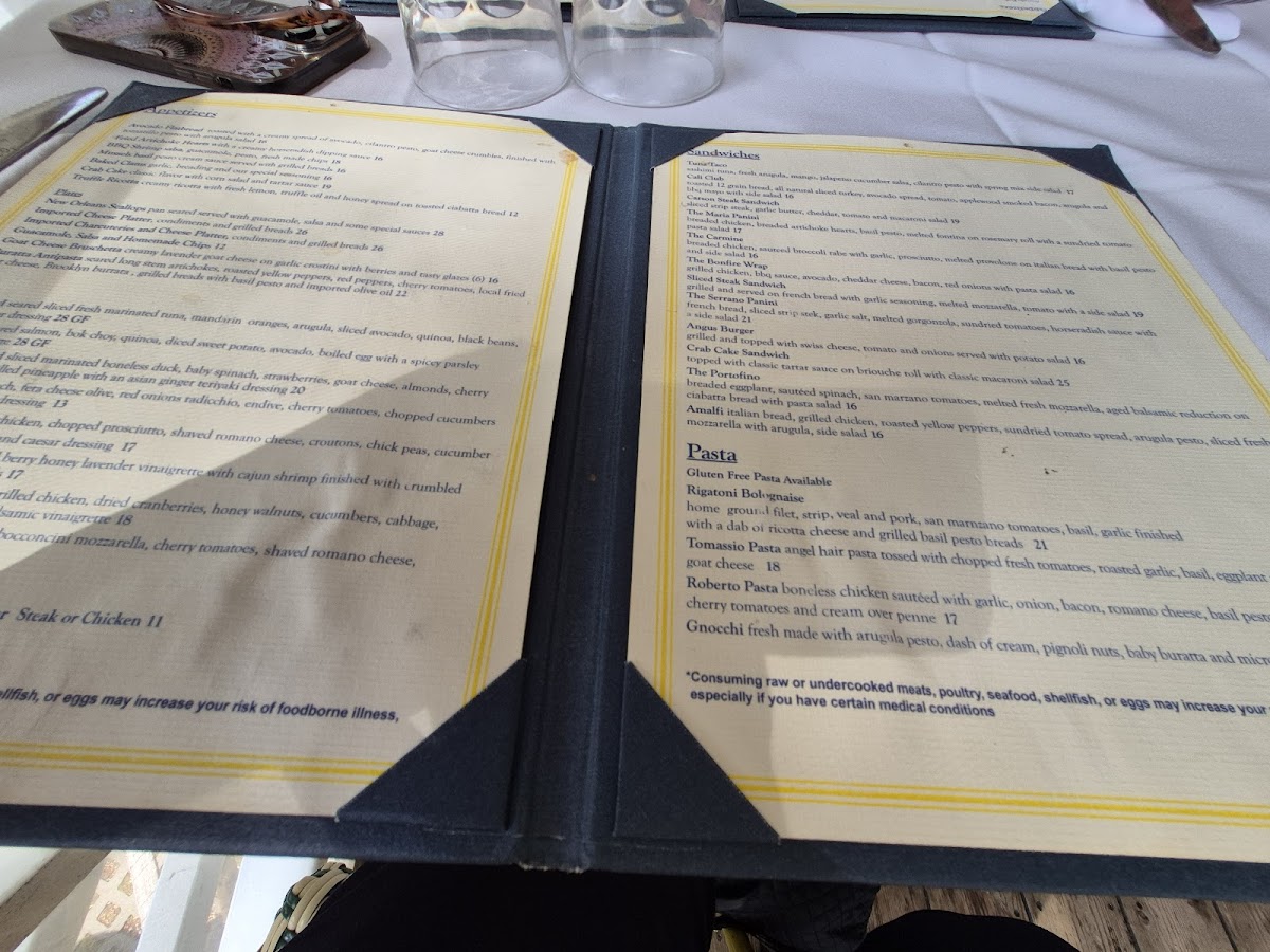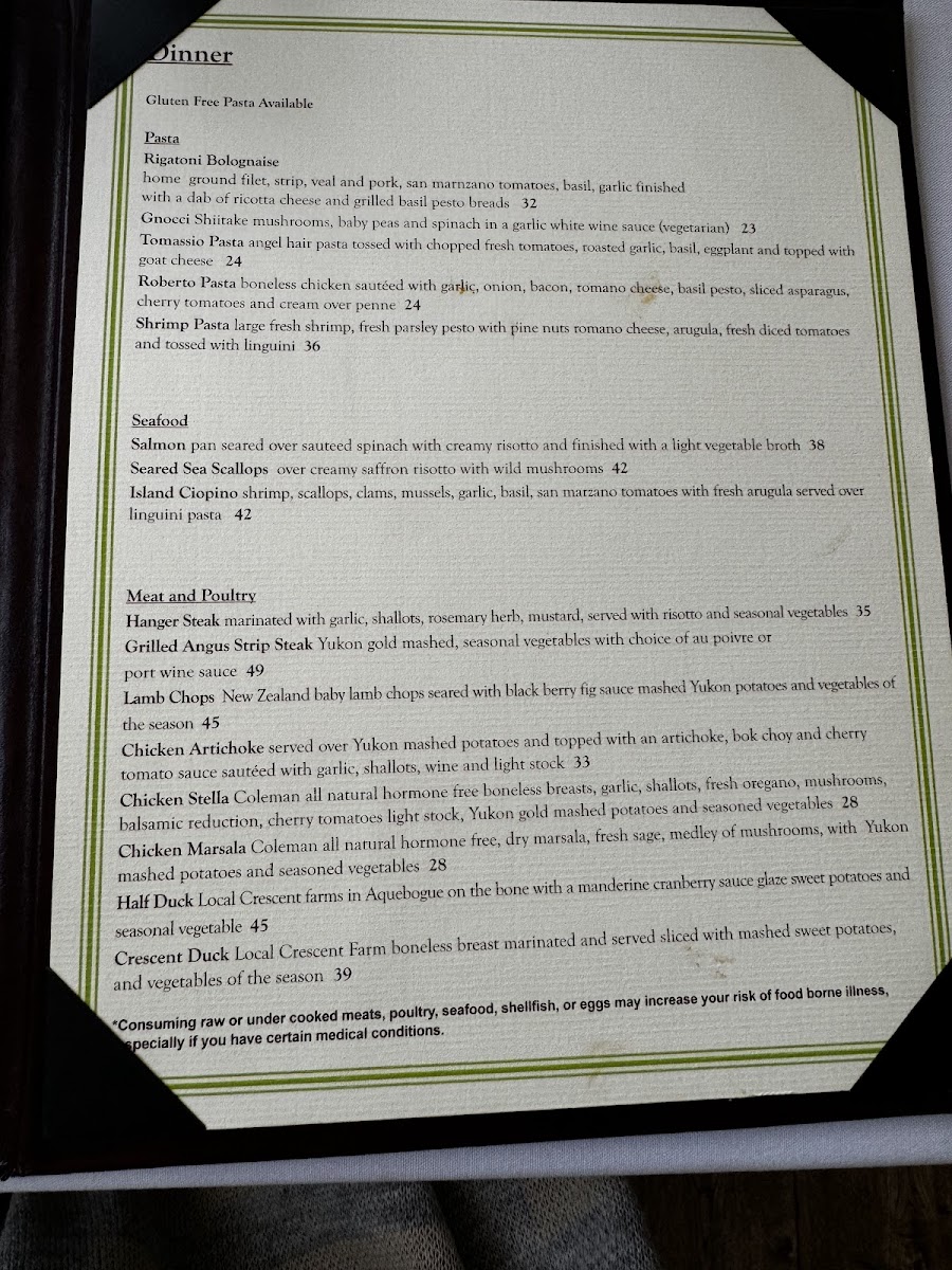 Additionally, the menu highlights various pasta dishes and entrees such as risotto, Roberto pasta, penne, rigatoni bolognese, island cioppino, lamb chops, hanger steak, and sea bass, providing options for diners seeking more substantial meals.
